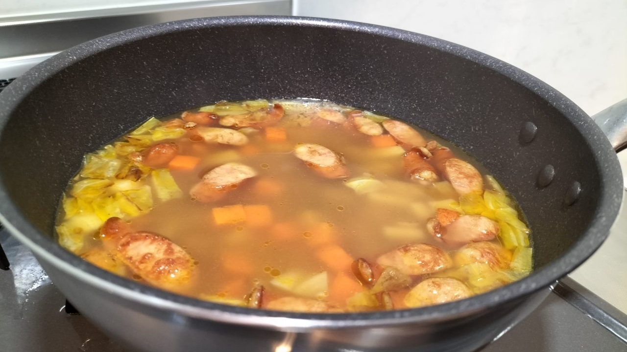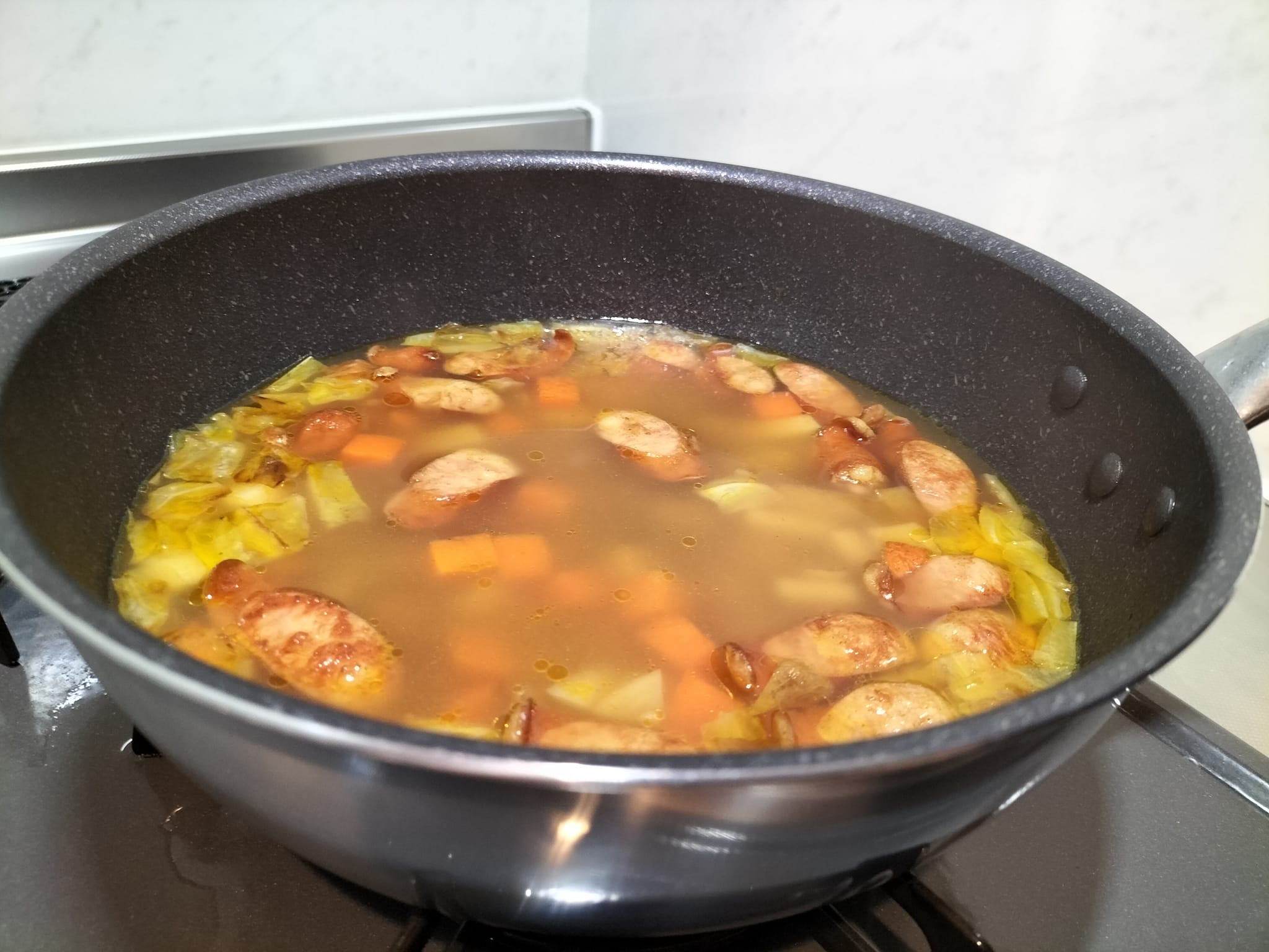 ④ 水、コンソメを加えて蓋をし、沸騰してきたら弱火で20~30分煮ます。