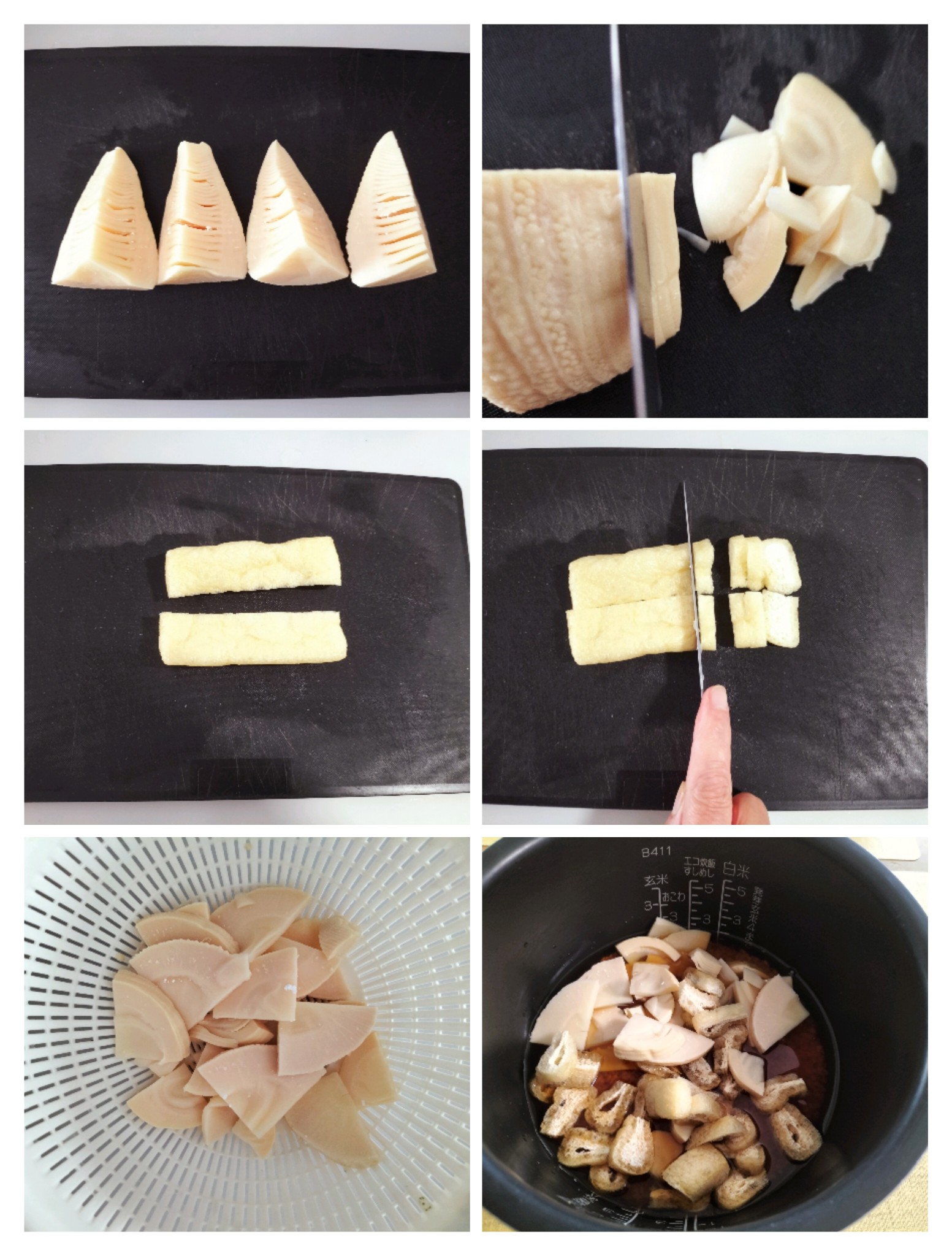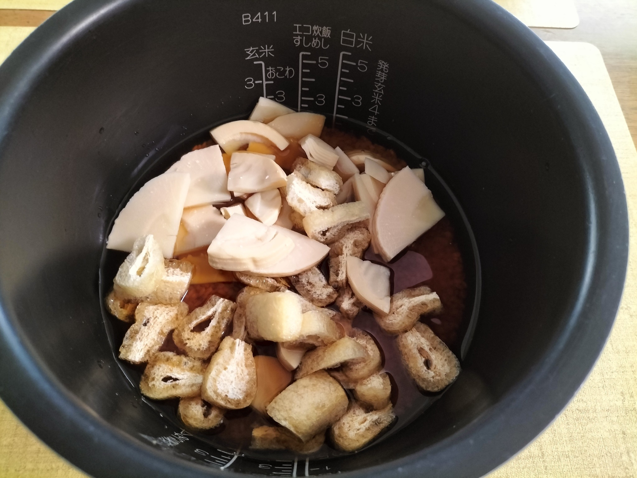 ⑥、たけのこの水煮、油揚げを加え、炊飯します。