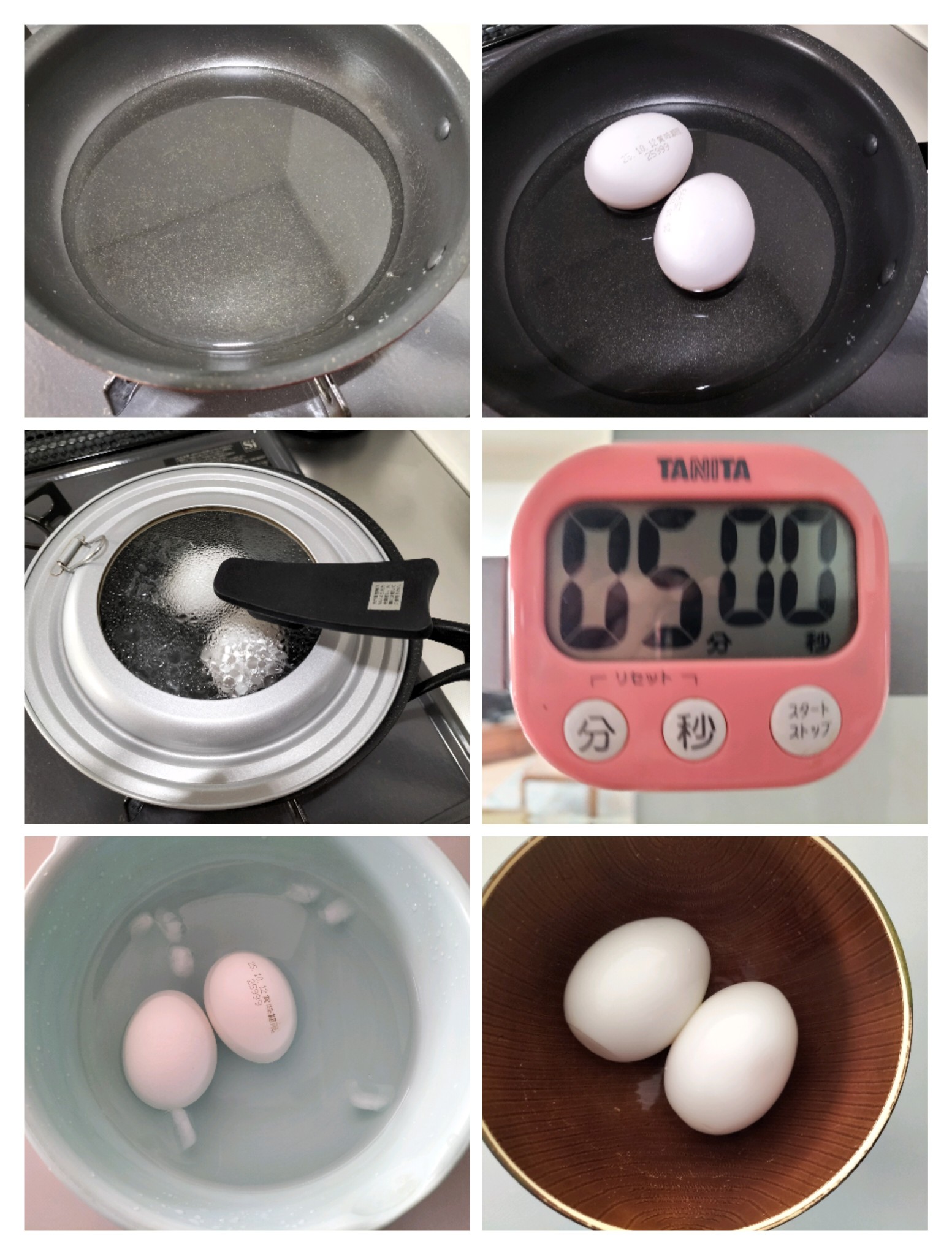 お使いのフライパンや火力で違いがあると思いますが私は、5分加熱し5分放置でちょうど固ゆでと半熟の中間位の茹で卵になります。