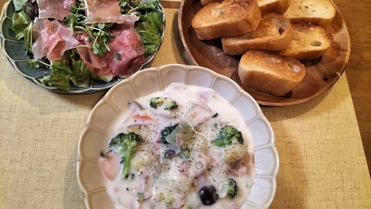 このシチュー、塩バターパン、生ハムサラダの組み合わせで、温かい家族の時間を楽しんでくださいね。