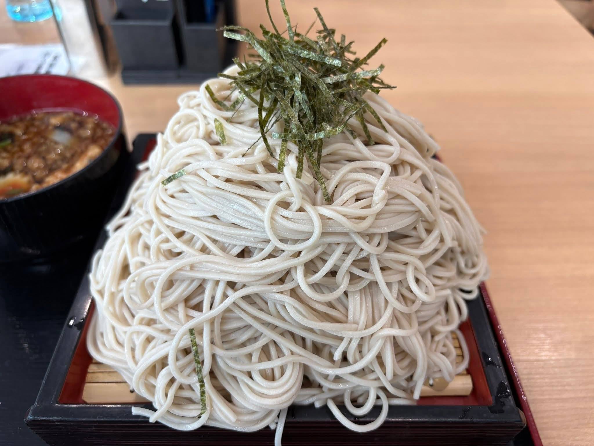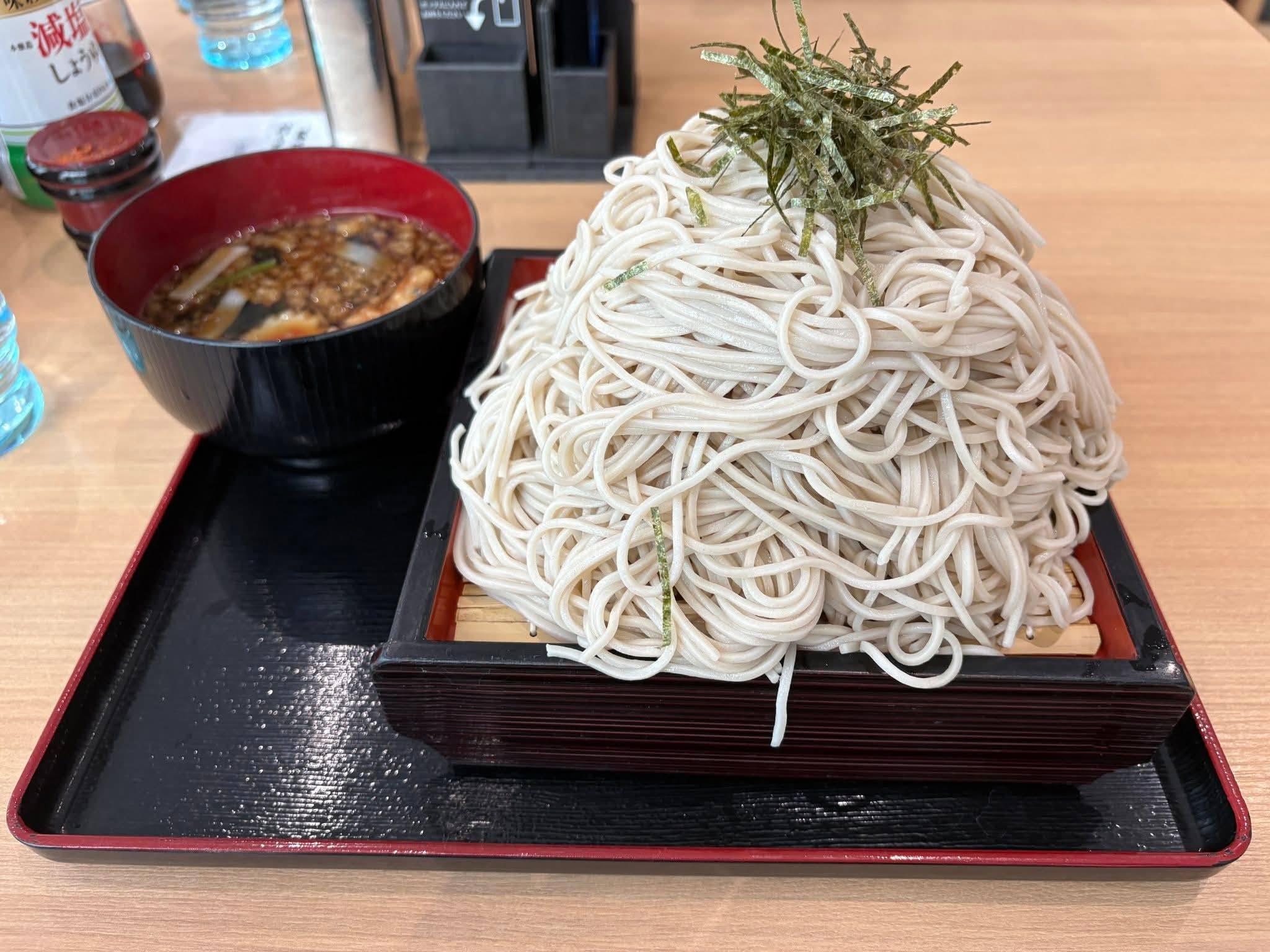 名物の「大特ざるそば」は、温かい具だくさんのつゆで食べる1kg超えのデカ盛りメニューで、平日の昼時は行列ができるほどの穴場スポットです。