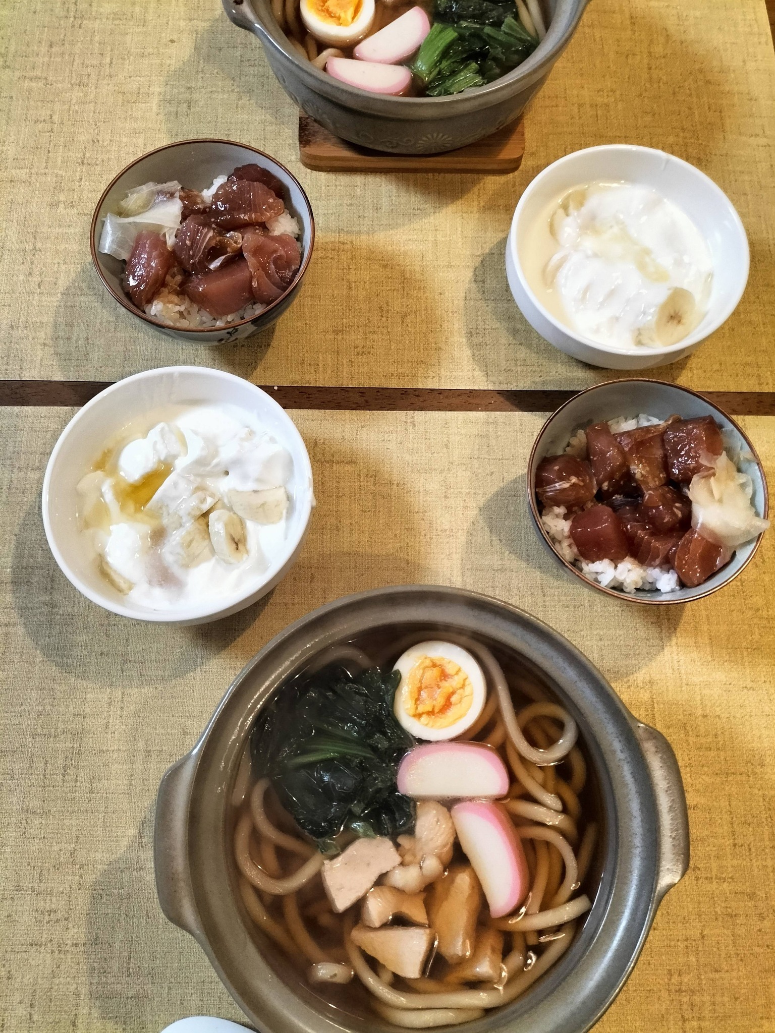 鍋焼きうどん、ミニ海鮮丼、バナナヨーグルトの組み合わせは、見た目も華やかでバランスの良い夕飯になります。